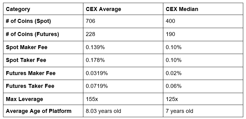 中心化交易所平均支持706种加密货币(中位数:400),头部平台提供多达3800种资产,小型交易所仅支持80种。衍生品方面,中心化交易所平均提供228个期货市场(中位数:190),顶级平台提供超700种衍生品。平均最高杠杆为155倍,有两家交易所为专业交易者提供500倍极限杠杆。