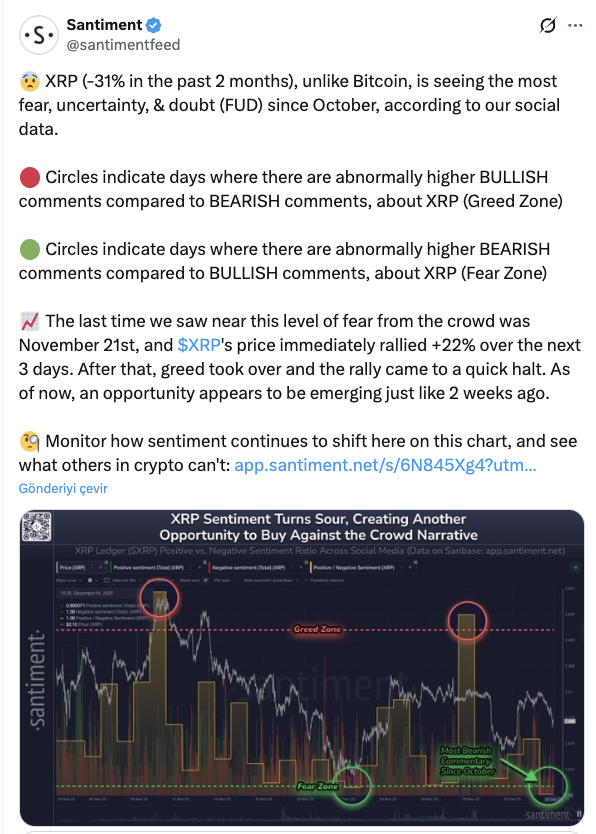 Santiment图表通过彩色圆圈标注市场情绪极端化的日期:红色圆圈代表积极评论占主导的"贪婪区间",绿色圆圈则代表负面观点主导的"恐惧区间"。在11月21日XRP上次出现同等恐惧水平后,其价格仅在三天内就上涨了22%。Santiment指出当前情景与前期相似,暗示XRP价格可能即将迎来反弹。