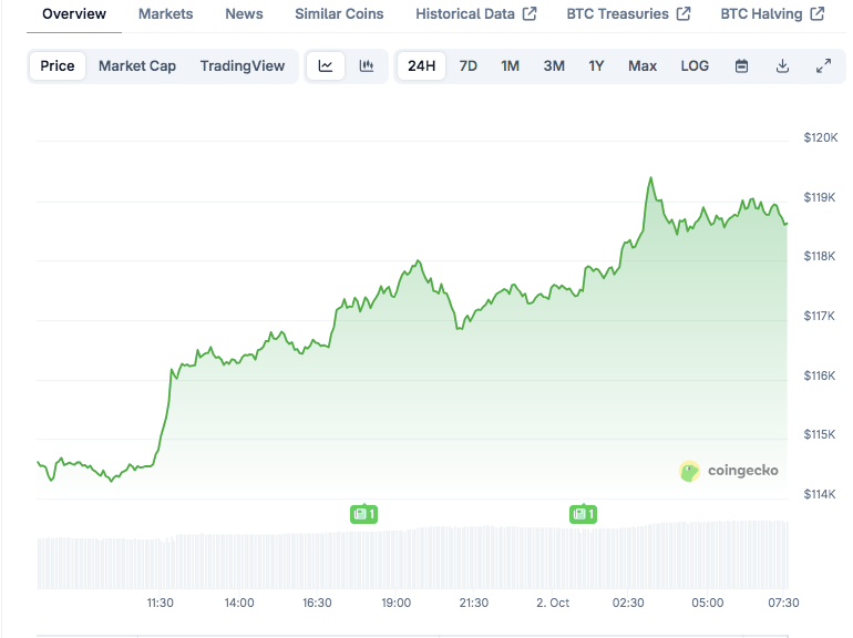 CoinGecko数据显示比特币现报118,858美元,24小时交易量超760亿美元支撑下,周涨幅达5.32%。新季度伊始的价格强势,使得市场对季节性趋势延续的预期升温。