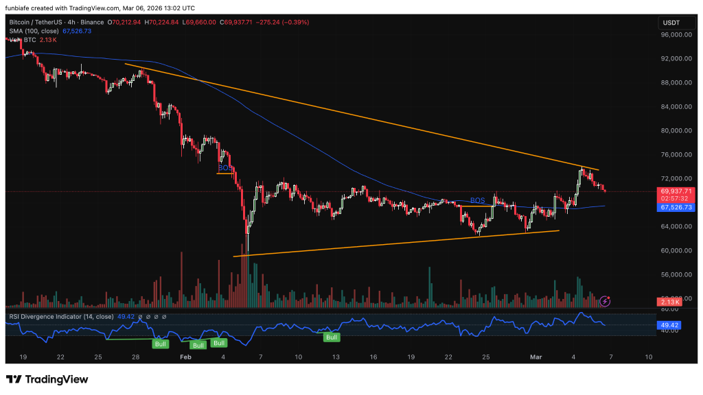 有几个关键的技术结构引人注目:一条来自前期高点的下降阻力线持续压制涨势,同时价格下方已形成一条上升支撑趋势线。两者共同将比特币价格挤压进一个收窄的楔形中。二月底,图表显示结构突破(BOS)推动比特币价格逼近72,000美元,但卖盘再次在该下降阻力线附近介入。