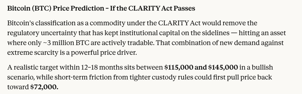从长期前景看,市场情绪更为乐观。Claude AI的长期预测认为,若《清晰法案》能为市场带来亟需的监管明确性,比特币价值可能达到115,000至145,000美元。