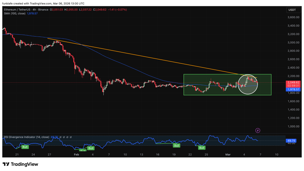 以太坊在图表上呈现非常相似的结构,但其盘整区间更为清晰。最近几周,以太坊一直在1,850至2,200美元的狭窄区间内交易,市场在初期下跌后正尝试企稳。