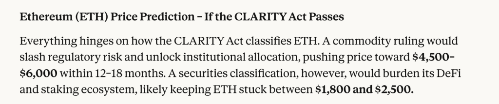 Claude AI的宏观展望很大程度上取决于以太坊在《清晰法案》下的分类。若以太坊获得商品地位且监管不确定性消退,该模型预测,随着机构资本开始进入市场,未来12至18个月内以太坊价格可能攀升至4,500至6,000美元区间。