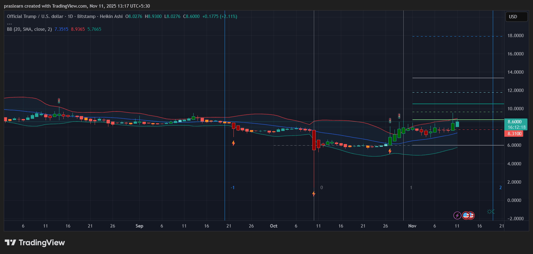 在TradingView的日线图上,TRUMP价格显示出新的看涨动能。Heikin Ashi蜡烛图显示价格决定性突破8美元阻力位,收盘于8.6美元附近,日涨幅2.11%。此前数周该代币一直在6-8美元区间横盘整理。