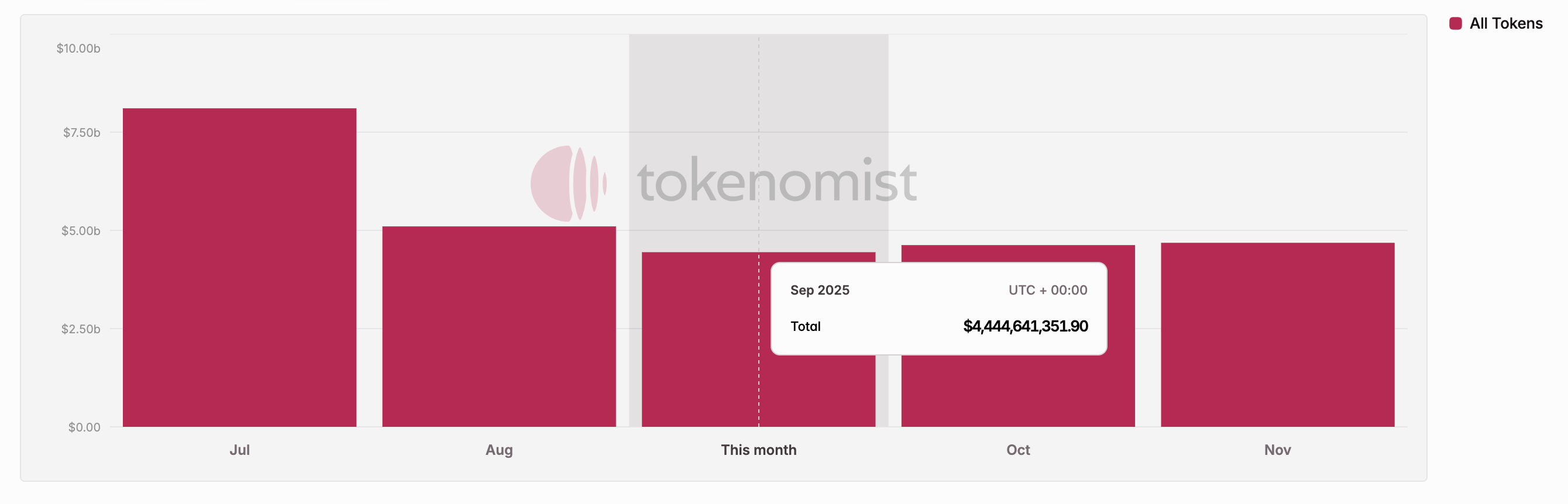 9月份,加密货币市场将迎来价值约45亿美元的代币释放。根据Tokenomist数据显示,其中11.7亿美元属于一次性释放,33.6亿美元将通过线性解锁方式逐步释放。这一重大事件对投资者、项目团队及其他市场参与者具有深远影响。