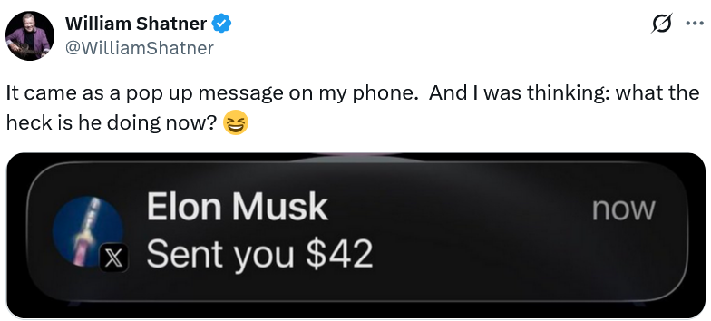 夏特纳将马斯克赠与的42美元转化为慈善募捐活动。经X平台授权,他先后拍卖了42个及166个测试邀请名额,每个名额标价1000美元。中标者除获得X提供的25美元欢迎礼品卡外,还将收到马斯克最初赠予夏特纳的1美元款项。