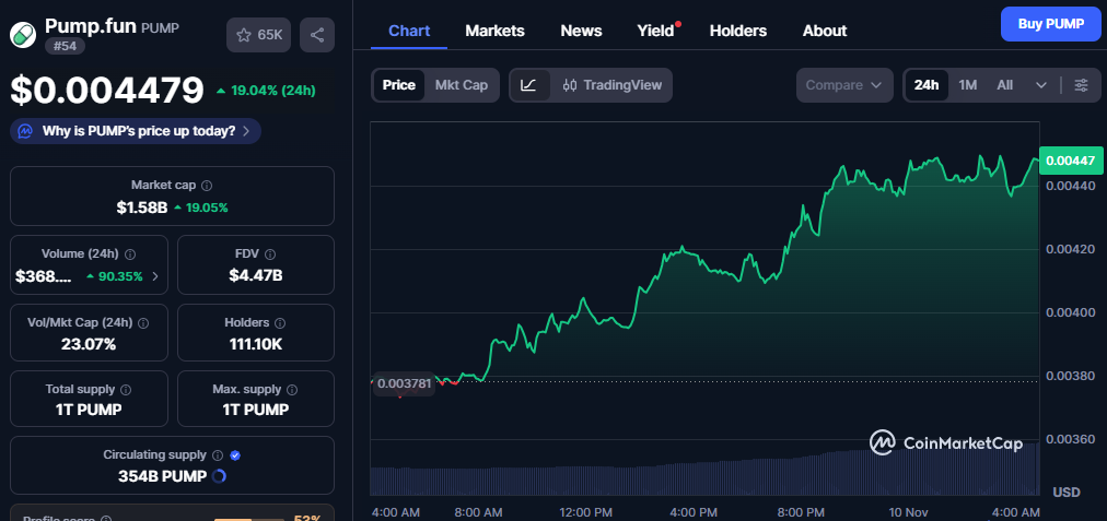 PUMP在过去24小时内上涨19.04%,当前报价0.004479美元。该代币从0.00378美元的关键支撑位强势反弹,同期交易量激增90.35%,达到3.68亿美元,市值攀升至15.8亿美元。