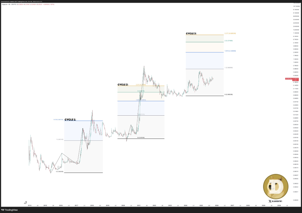除楔形形态分析外,部分分析师通过斐波那契回撤位预测未来价格。JavonMarks指出历史周期中,狗狗币总能触及1.618斐波那契位。据此测算,下个周期可能上涨至2.28美元(较当前0.247美元涨幅800%)。若遵循历史规律,最终或冲击9.8美元,实现3690%以上的惊人收益。