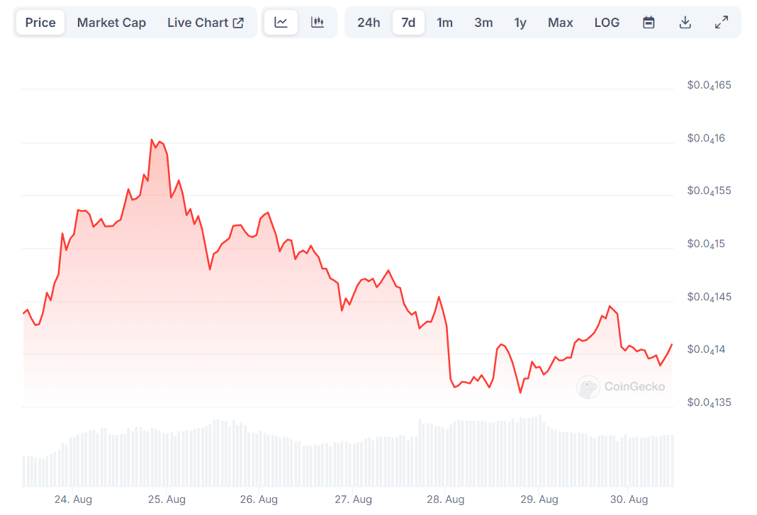 根据CoinGecko的数据,柴犬币目前交易价格约为0.0000141美元,周跌幅为2%。其表现不佳与迷因币板块的整体下跌相吻合,狗狗币(DOGE)、dogwifhat(WIF)、Pepe(PEPE)、Bonk Inu(BONK)、Brett(BRETT)等在同一时期均大幅下跌。