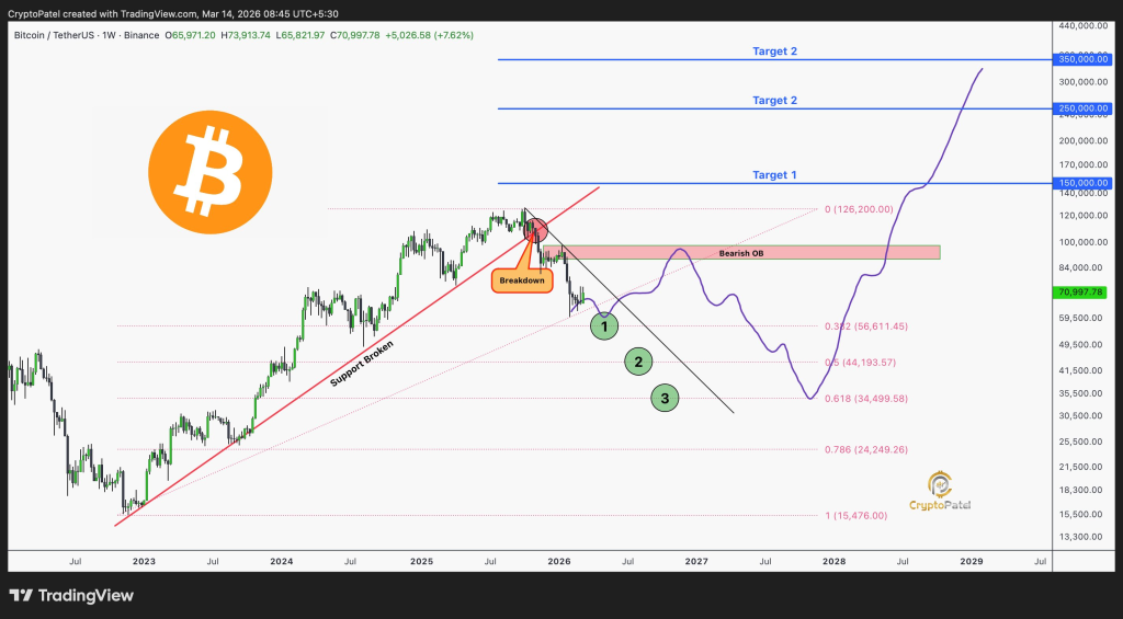 加密货币分析师Crypto Patel指出,近期回调可能已揭示了未来几年比特币价格的更宏观路线图。他通过周线图分析,描绘出BTC可能的积累区间与长期价格目标,其观点聚焦于市场结构、斐波那契回撤水平以及多头最终必须攻克的关键阻力带。