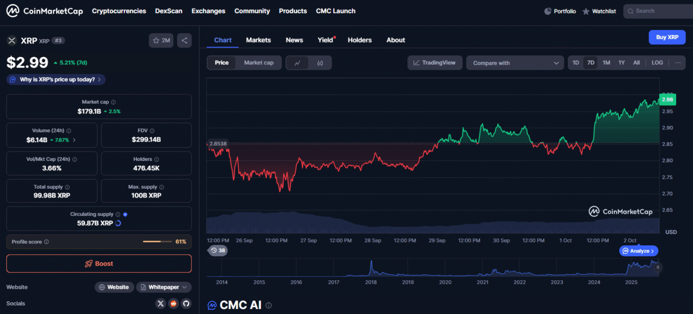 经历市场整体下跌后,XRP当前价格2.99美元,周涨幅5.21%。分析师Ali Martinez指出:
