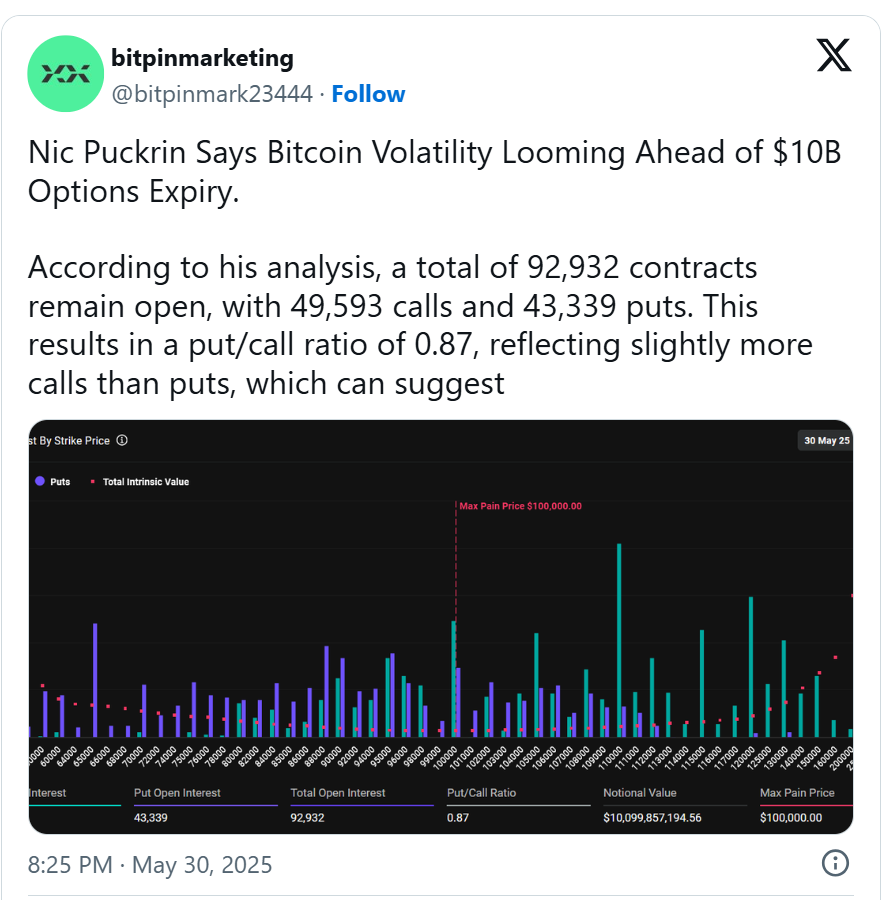 最新数据显示,价值超100亿美元的比特币期权于当日到期。看涨合约数量显著高于看跌合约。