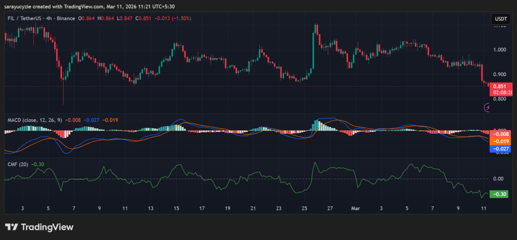 Filecoin(FIL)下跌8%,滑落至0.85美元。交易量暴涨超过112%。