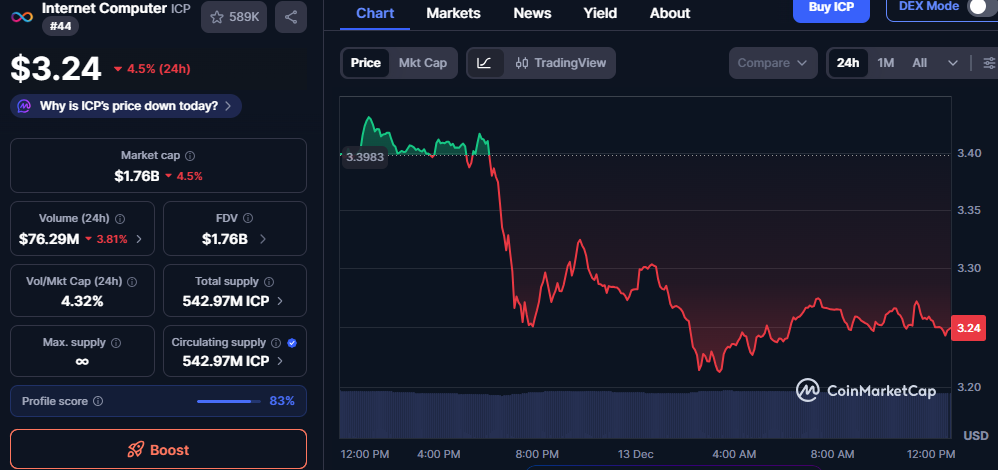 经过持续的日内抛售活动,Internet Computer在3.24美元水平附近交投。该代币在各大交易平台录得约4.5%的日跌幅,同期表现逊于多个同类数字资产。