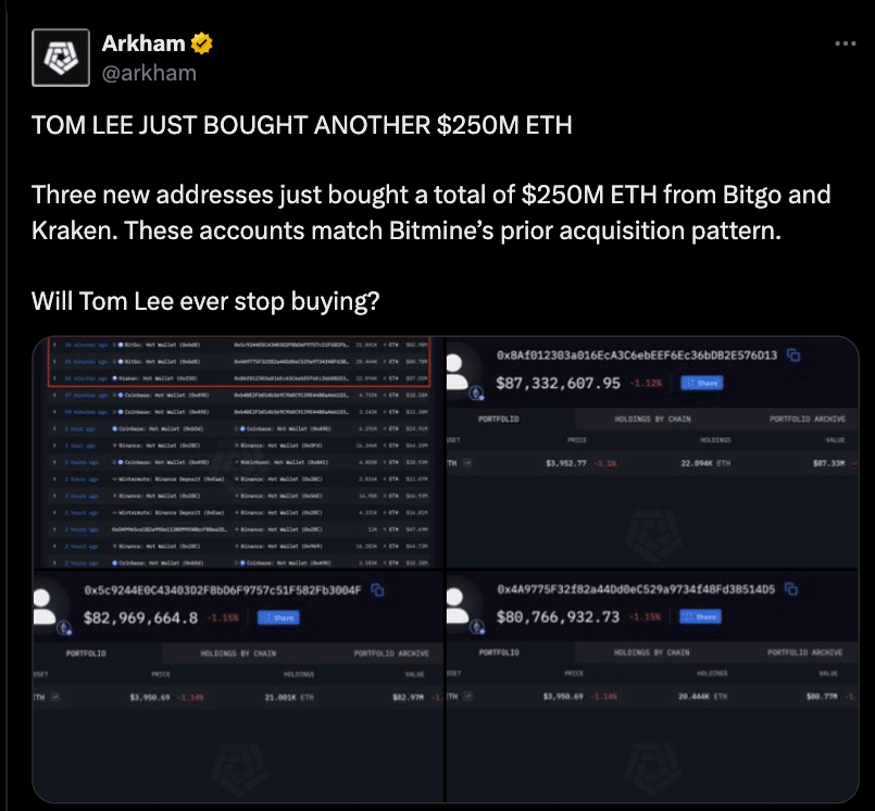 据Arkham Intelligence数据,本轮增持通过多笔交易完成:在大规模去杠杆事件引发市场下跌期间,公司从BitGo、Kraken等交易所购入$ETH。