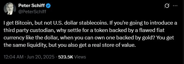 Peter Schiff近日批评美元稳定币是锚定在不断衰退的法币体系上的弱势数字资产。此番言论正值美国推进新立法以支持稳定币使用之际。