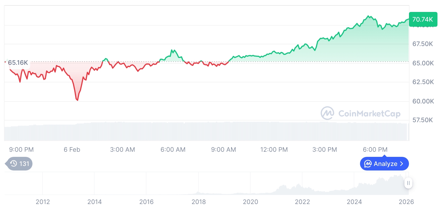 根据行情数据,比特币在昨日急跌后企稳,现报69,500美元,24小时内涨幅近6%,但较上周同期仍下跌16%。周四盘中比特币曾最低触及60,225美元。