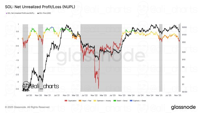 Solana网络未实现盈亏图表显示该资产已进入新一轮投降区间。过去两周的数据模式反映出市场普遍处于亏损状态,恐慌情绪持续蔓延。阿里在社交媒体发布的更新指出,类似行为曾标志着历史周期低点的形成。
