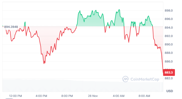 BNB在24小时微跌0.59%后交易于887.26美元附近。图表显示价格在880美元上方区间与894美元上方短暂突破之间反复震荡。这些波动表明市场持仓趋于谨慎,交易者正在对变化中的市场条件作出反应。