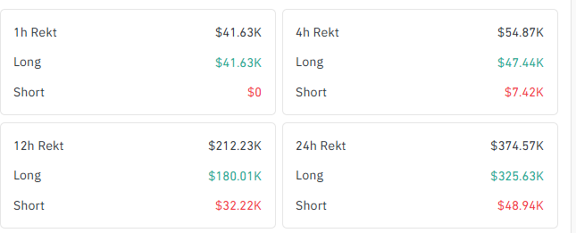 24小时清算总额达374,570美元,其中325,630美元来自多头。空头清算仅48,940美元。这种分布表明多头交易者多次尝试捕捉反弹均告失败,而看跌头寸在整个交易时段保持稳定控制。