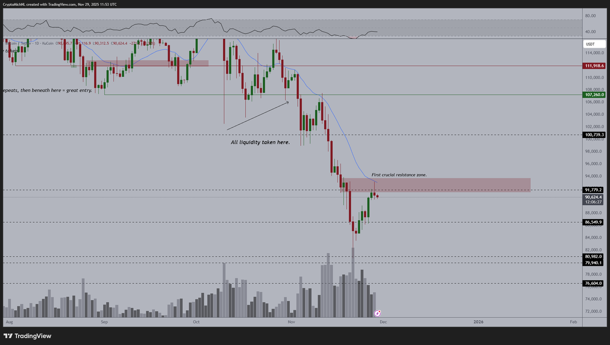 成交量分布显示近期低点下方存在流动性吸收,而日线图显示首个有效阻力区位于91,000-94,000美元区间。若无法收复该区域,将确认卖方仍主导短期格局。
