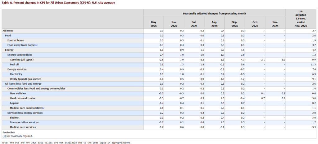 2025年9月至11月期间,所有城市消费者的CPI(CPI-U)上涨了0.2%。由于政府停摆,该数据的计算略过了10月份。
