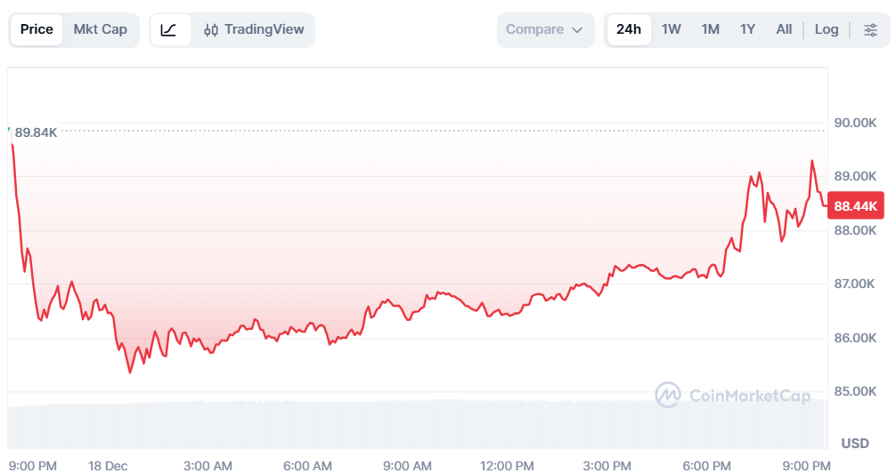 截至发稿时,根据CoinMarketCap数据,BTC价格为88,367美元,反映出1.3%的小时涨幅。日内则下跌了0.3%,周线下跌半个百分点。过去24小时交易量增长20%,达到461亿美元。