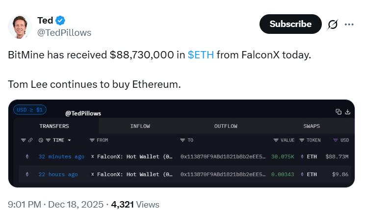 CPI数据发布后不久,BMNR股价为30美元,随着比特币价格的飙升,在开盘时上涨了4.3%。值得注意的是,这家以太坊(ETH)国库公司在CPI数据发布后不到一小时就扩大了其ETH储备。