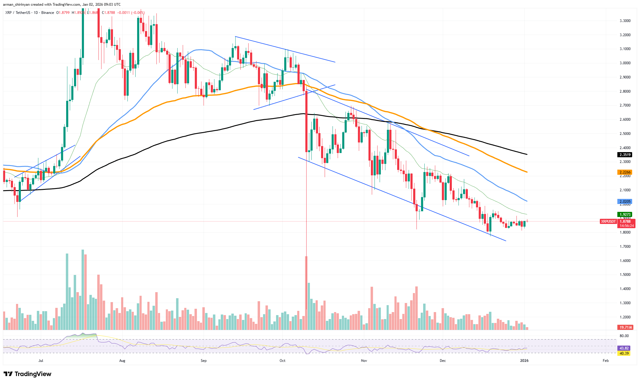 从结构层面观察,这一变化正值XRP价格持续在长期支撑位附近整固。虽然图表显示XRP仍处于关键移动均线下方,并处于更大周期的下跌趋势中,这本身并不构成看涨信号。但值得注意的是,此时价格与基本面出现了背离。历史经验表明,在积累阶段,账本活动的持续增长往往先于价格启动。