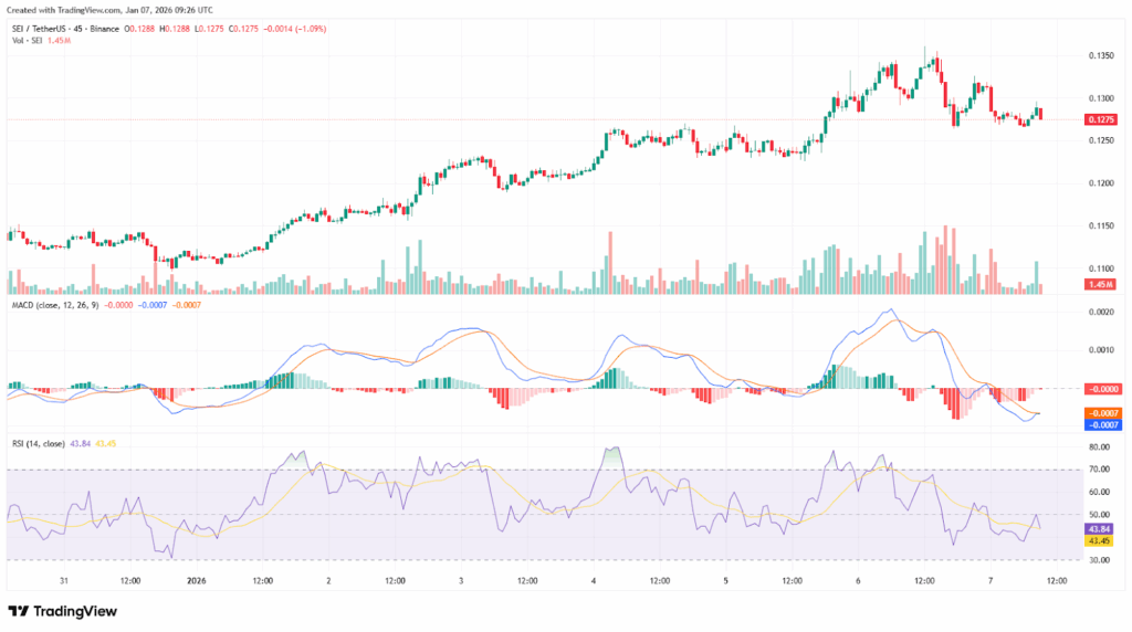 SEI/USDT交易对近期在0.127-0.129美元区间整固,价格从0.112美元附近稳步升至0.135美元峰值,形成渐高的高点与低点。突破性K线伴随放量,表明市场参与度强劲。MACD与RSI等动量指标显示热度降温而非趋势逆转。