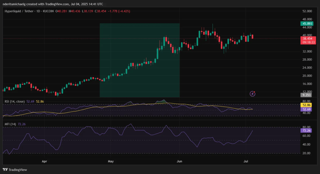 HYPE代币在2025年第二季度表现亮眼,季度内实现从最低点到最高点390%的惊人涨幅。这一牛市表现与激增的代币交易量相符。但自6月中旬以来,HYPE的多头力量显现疲态,表现为后续上涨乏力及RSI指标回落。