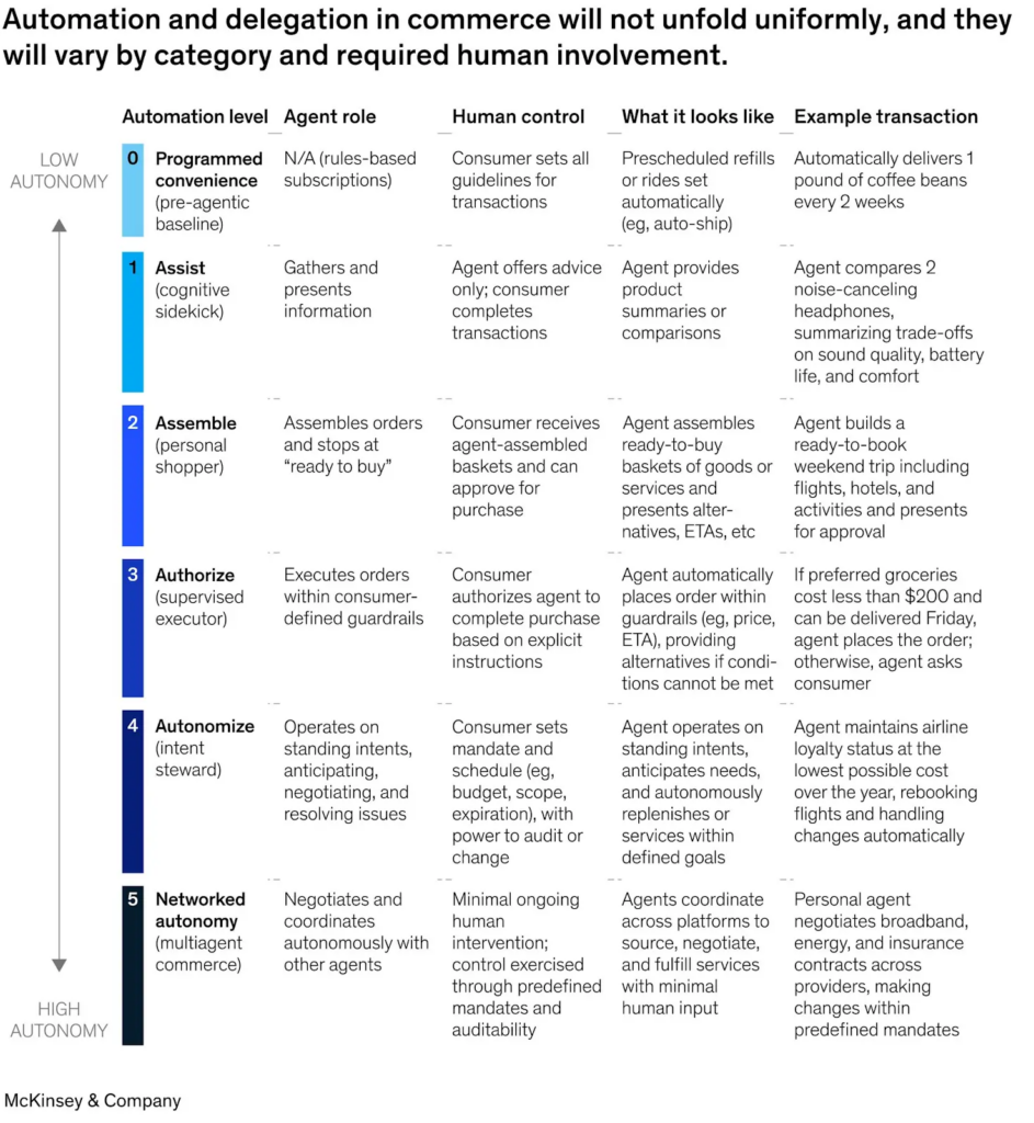麦肯锡将AI驱动的商业自动化分为六个层级。从0级到4级,系统仍可在现有金融框架内运行,因为每笔交易最终仍关联人类身份。但到第5级,代理开始无需人类指令直接相互交易。此时既无人类身份可继承,传统KYC流程亦无法适用。支付须具备可编程性、条件触发与毫秒级结算能力,而这些代理的声誉也需跨平台便携。在此条件下,区块链成为不可或缺的基石。