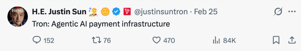 众所周知波场网络承载着全球流通量最大的USDT。如前所述,Web4.0的核心在于机器间支付。AI系统需要的是转账迅速、费用低廉且流动性深厚的支付网络。波场的USDT支付基础设施与AI代理的底层金融需求几乎完美契合。孙宇晨仅需在波场上搭建一套AI系统可无缝接入的支付API,便能在Web4.0时代持续轻松捕获价值。