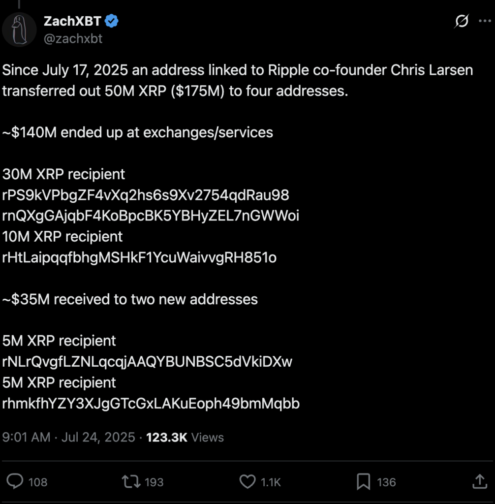 区块链分析师ZachXBT披露,7月17日至24日期间,与联创克里斯·拉森关联的钱包转移了总值1.75亿美元的XRP代币,其中1.4亿美元最终流入加密货币交易所地址。