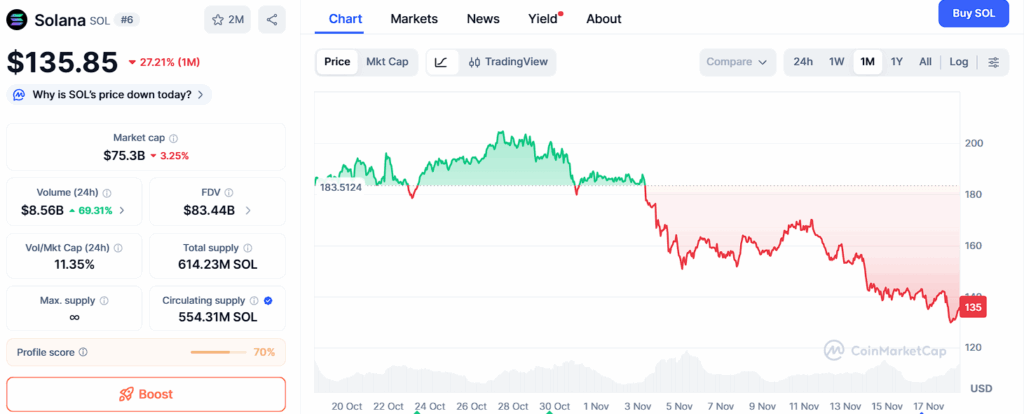 Solana在135美元附近同样显示出坚实的上涨结构,这得益于用户关注度提升、总锁仓量增长以及其作为行业最快公链之一的声誉。买家在130美元、122美元和114美元等关键价位持续提供支撑,随着Solana在潜在新一轮上涨前企稳,市场信心得到强化。
