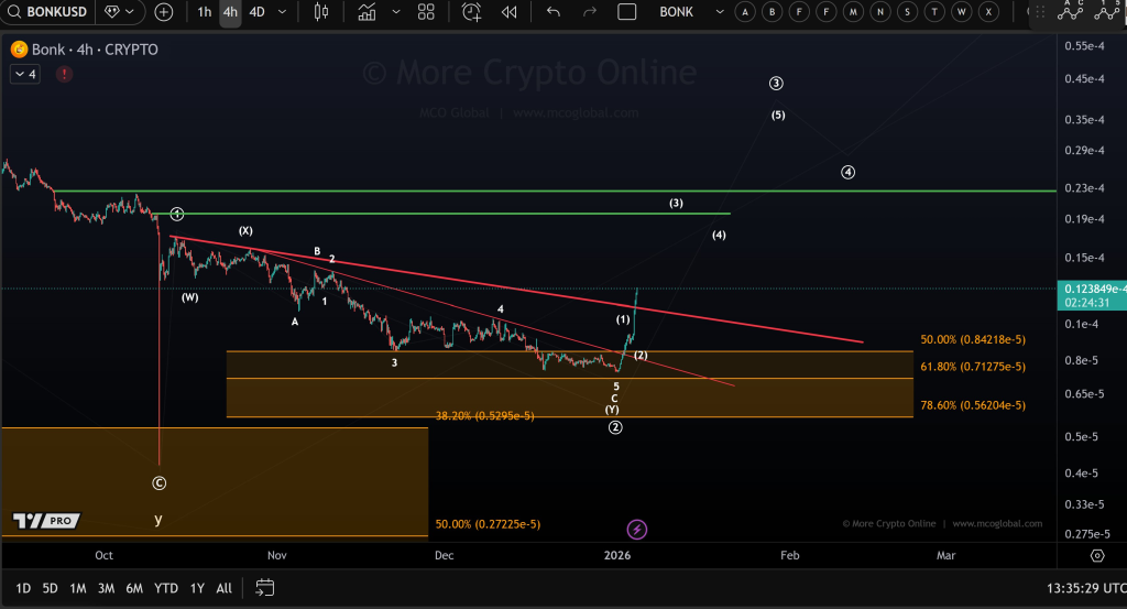 若BONK能维持突破态势不回落至0.0000084-0.0000071美元需求带,则最小阻力路径将继续向上。首要上行目标为10月高点区域,关键阻力带位于0.0000197-0.0000230美元区间,与More Crypto Online标注区域完全吻合。