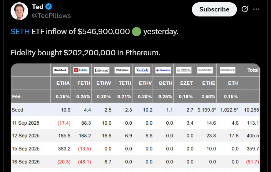 此外,机构需求也助推了这波上涨。以太坊现货ETF单日录得5.469亿美元资金流入,其中富达贡献2.022亿美元,贝莱德贡献1.54亿美元。