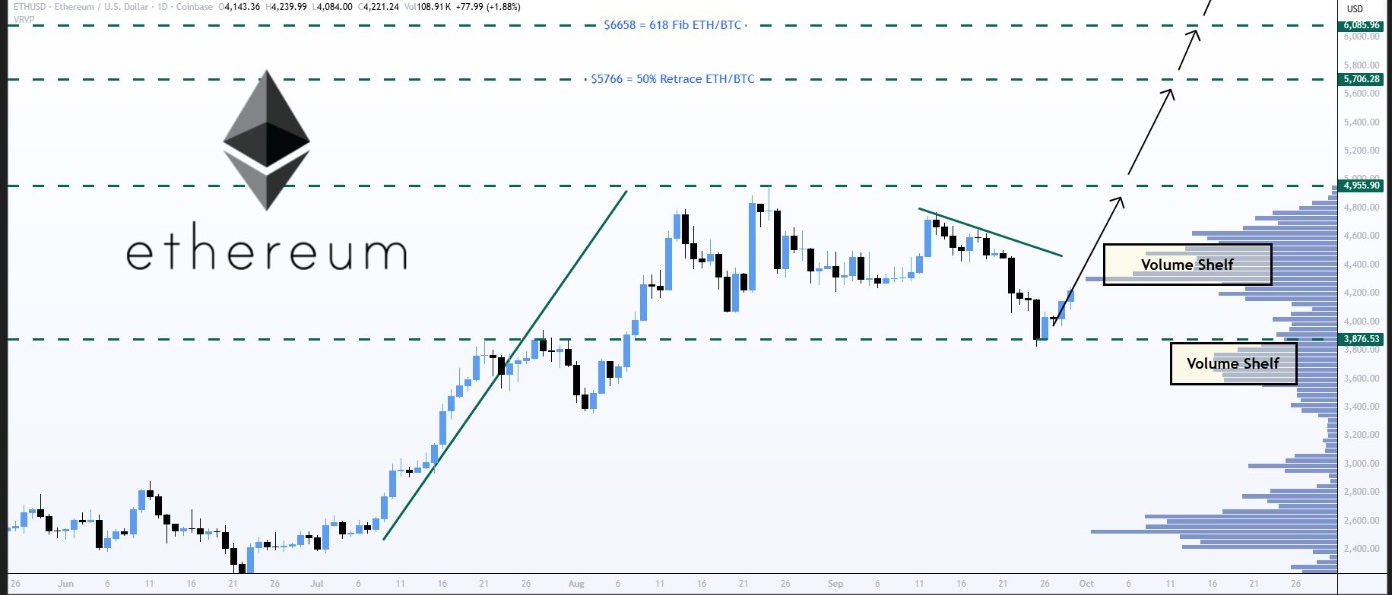 若以太坊突破4,275美元阻力位,后续阻力位分别在4,450美元和4,800美元。除此之外,中期目标价位设在5,766美元,分析师表示该价位既符合斐波那契回撤趋势,也与ETH/BTC比率设置相匹配。市场分析师Donald Dean指出,5,766美元关口还与今年早些时候观察到的历史突破结构相关。