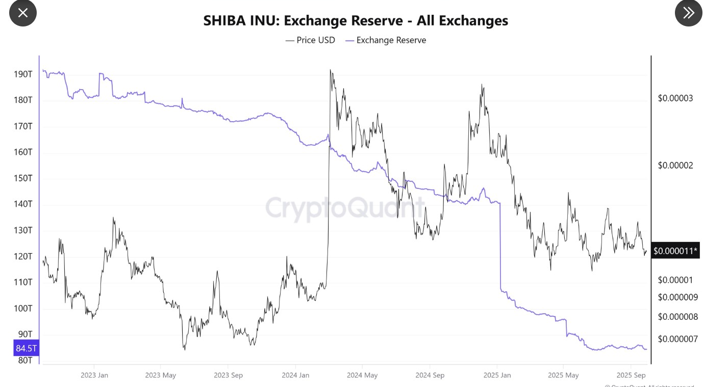 与此同时,柴犬币(SHIB)可能正在为"十月突破"做准备。分析师Zayn透露,SHIB交易所储备已降至84.55万亿枚,创两年新低。2023年1月交易所持有近190万亿枚SHIB,意味着供应量减少超55%。