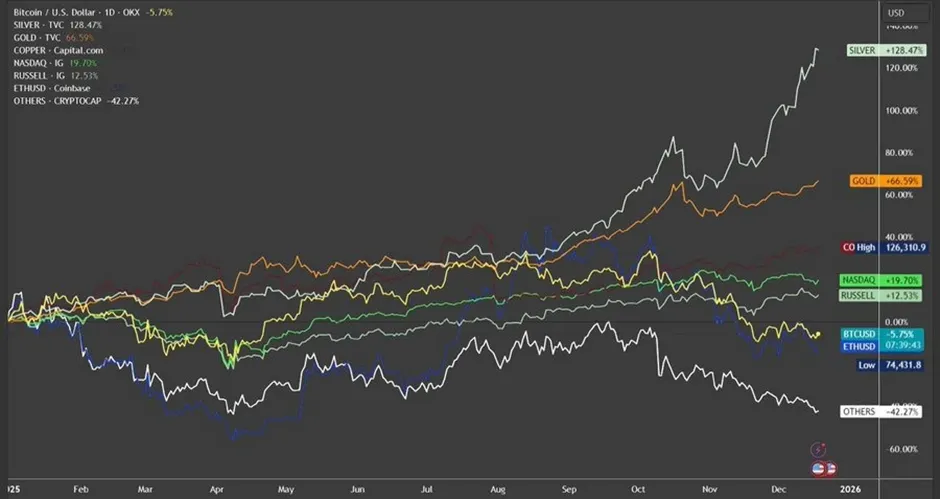 白银涨幅超130%,铜价上涨约35%。这些并非高风险资产,而是在经济放缓时被视为价值储存工具的工业金属。股市同样表现优异:纳斯达克指数上涨近20%,标普500指数涨幅约16%,罗素2000指数攀升约13%。