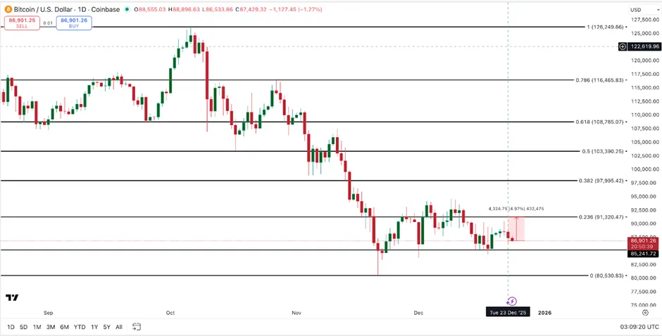 比特币价格必须回升至91300美元(涨幅5%),才能避免年终收跌。