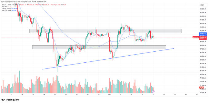 过去24小时内,价格曾突破91,000美元但早期动能消退。在91,300美元附近的阻力引发价格向89,964美元可控回落。抛售保持有序进行,而每次反弹尝试都因缺乏量能支撑而减弱,表明需求正在消退。