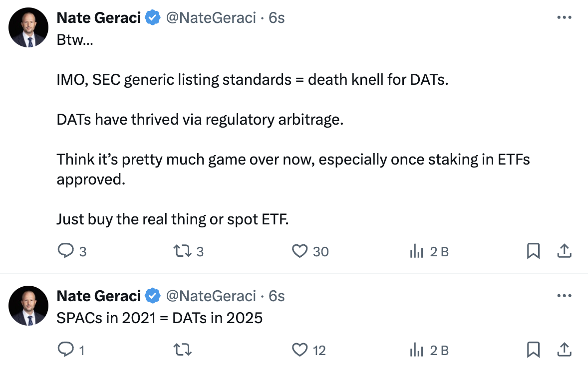 ETF专家Nate Geraci指出,SEC批准的新上市标准使加密货币ETF直接成为国库企业的竞争对手。他强调,虽然这些企业历史上受益于监管差异,但ETF的出现消除了这一优势。