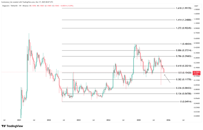 DOGE在周线收盘后精准锚定0.5对数斐波那契回撤位(基于2022-2024年主升浪绘制),该位置正处于结构性支撑区域。行情猫@cantonmeow的图表显示,尽管承受持续压力,周线仍牢固守住这一中位线。0.152-0.155美元区间持续发挥着市场平衡中枢的作用。