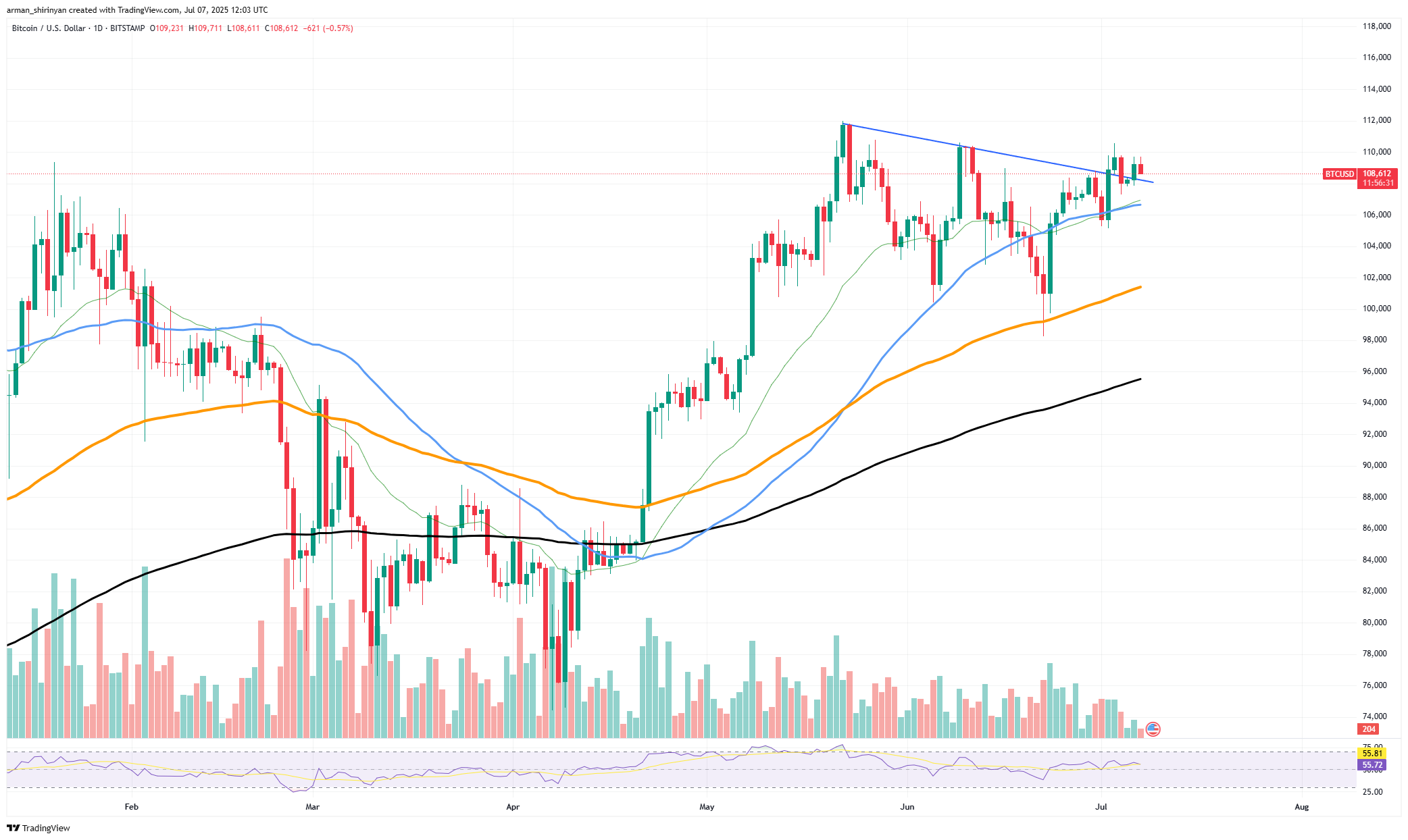 图表清晰呈现了比特币的第一轮上涨:4月中旬价格突破9.5万美元后,当月最高触及11.2万美元。随后出现的预期回调成功测试了50日均线的动态支撑。交易者始终期待第二轮强势上涨能将比特币稳定推升至12万美元上方,进而为冲击14万美元的抛物线走势奠定基础。