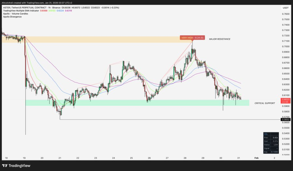Aster价格已回落至0.60美元的支撑区域,该区域在本月早些时候已被证明至关重要。分析师Ardi在X平台上指出,这一水平此前曾充当临时底部,但目前的结构显得更为脆弱。价格此前曾试图向0.72美元回升,该位置成为了主要阻力区并延缓了进一步的下跌。此次受阻回落的实际意义比最初看起来更为重大。