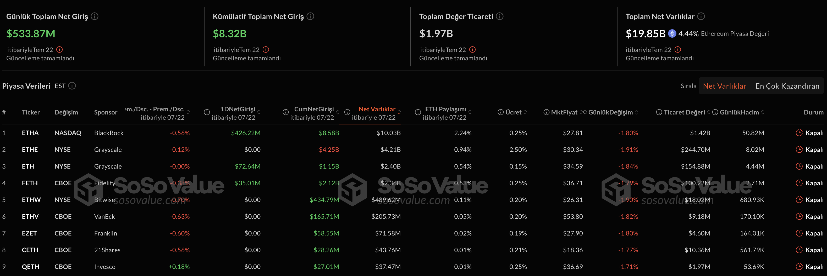 周二5.339亿美元的净流入规模,仅次于上周创下的7.267亿和6.02亿美元纪录。其中贝莱德ETHA产品独占鳌头,单日斩获4.262亿美元资金。与此同时,灰度迷你信托和富达基金分别吸纳7260万和3500万美元。