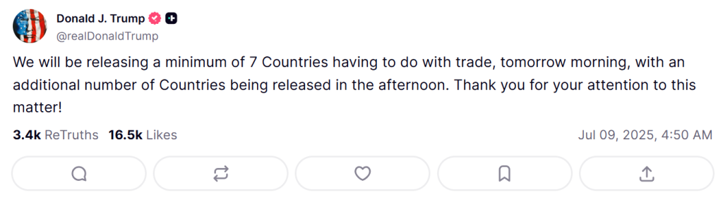 特朗普总统在周二晚间发帖表示,他已准备对至少7个国家宣布新的贸易关税,后续还将有更多国家被纳入名单。此举将引发全球股市和加密货币市场的剧烈波动。新关税税率定在25%至40%之间,将于2025年8月1日正式生效。