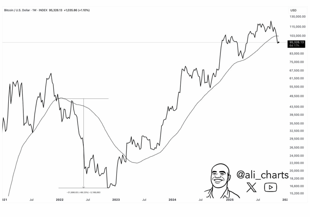 然而,尽管如此,分析师仍警告需保持谨慎。分析师阿里·马丁内斯呼应看跌情绪,指出比特币价格已跌破50周简单移动平均线,这在以往曾导致资产价值下跌66%。