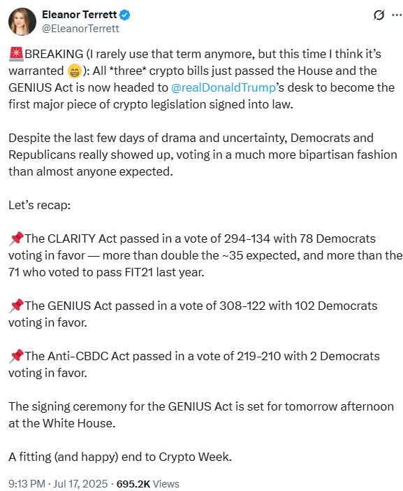 《GENIUS法案》则以308票赞成、122票反对的更大优势通过,102名民主党议员投下赞成票。该法案已提交至时任总统特朗普案头,若签署将成为美国首部重要的加密货币立法。